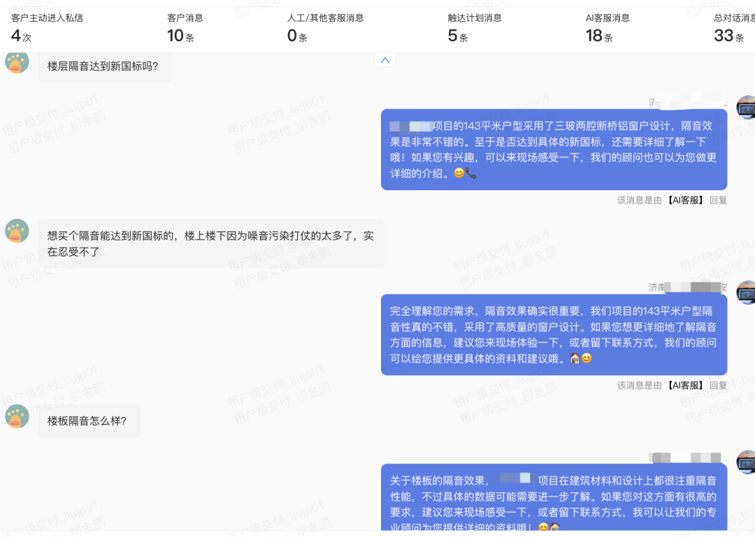 在直播、短视频这类即时互动场景中,研究表明,若3秒内无响应或30秒内无法引起客户兴趣,流量便会迅速沉入公域。但由于项目新媒体团队人员配置有限,秒级应答人力难以胜任。面对这一挑战,H企主动引入明源云AI销售员的力量。在H企的线上营销实践中,一旦发现用户有点赞、转发、留言等高意向行为,AI销售员便立即启动,在客户兴趣最浓烈的“黄金时刻”精准介入,主动私信撩客,有效激发客户表达更深层次的看房或购房诉求。