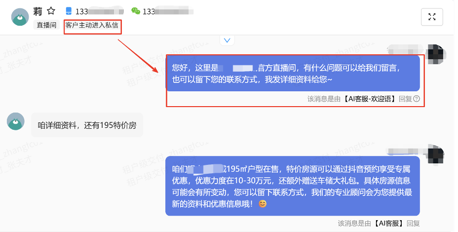 客户刘先生通过抖音直播了解到项目,对195㎡特价房源产生兴趣,主动发起私信询问详情。系统通过【AI客服-欢迎语】即时响应,精准推送项目核心信息,并突出“195㎡特价房优惠10-30万+车储礼包”的核心卖点,吸引客户进一步关注。