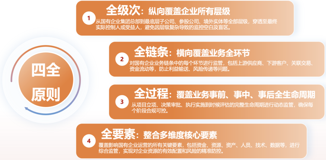 1)四全原则:根据《关于做好2025年中央企业内部控制体系建设与监督工作有关事项的通知》,穿透式监管要求覆盖“全级次(从集团总部到四级及以下单位)、全链条(资本-资产-资金-业务全流程)、全过程(事前-事中-事后全周期)、全要素(人、财、物、权全维度)”。