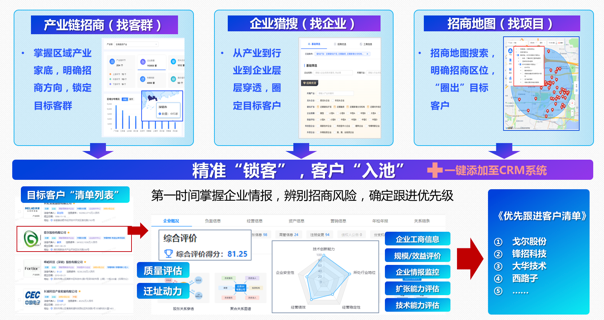 首先,通过产业链图谱,围绕着目标产业链和具体所在区域,形成一张「目标清单」,明确招商方向。