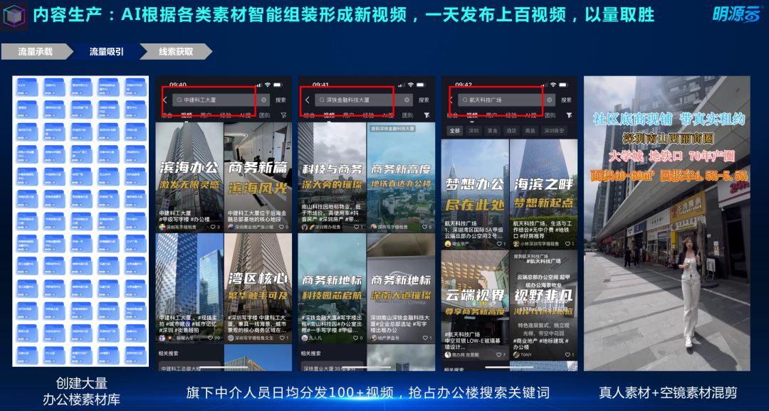 举个例子。中南高科从去年的国庆节开始搭建新媒体矩阵。其中,个人号账号401个 ,新媒体企业号41个,视频发布量15191条,直播场次3057场,获取电话线索2288条,吸引来访948组,通过新媒体实现招商面积超6万方,签约超2个亿。