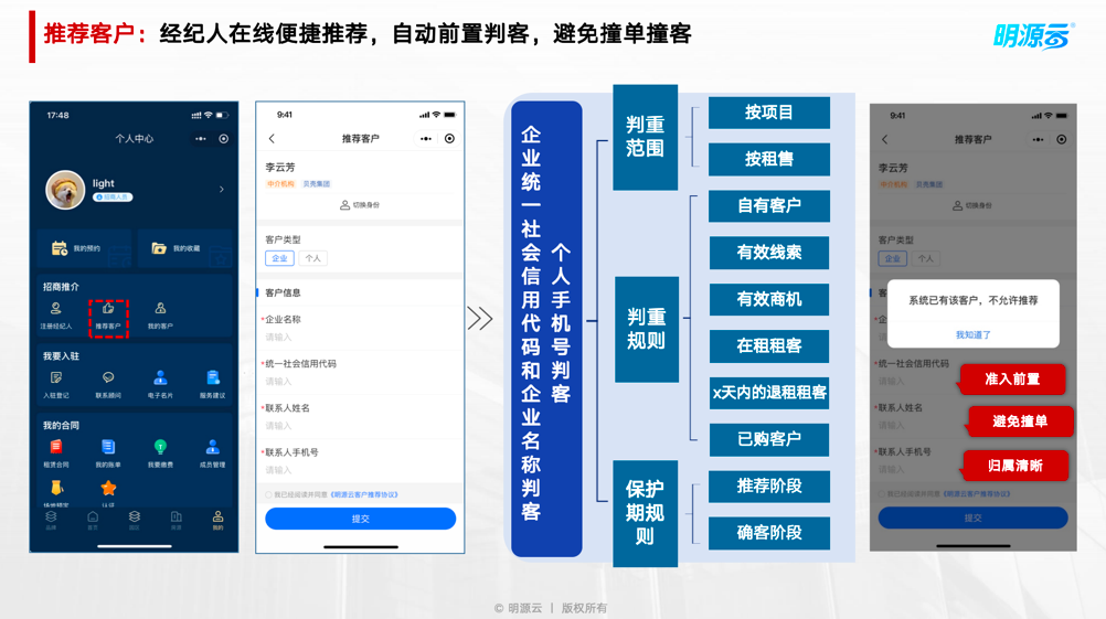 1、多渠道经纪人线上便捷注册,扩大经纪人范围。注册完成后,经纪人可以在线便捷推荐,自动前置判客,避免撞单撞客。