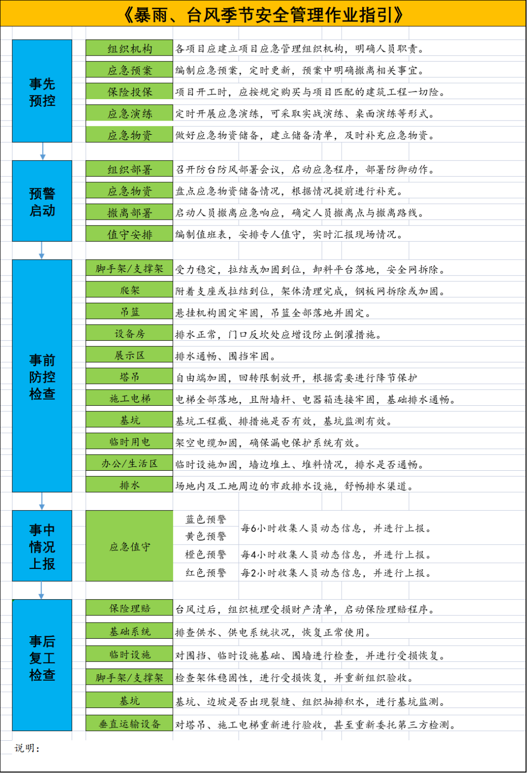 再次是应急响应程序化。面对台风、暴雨、极端天气等突发事件,制定安全管理指引细则。按照事先预控、预警启动、事前防控、事中上报、事后回复等5个阶段,对每一阶段制定标准安全动作,指导项目准确判断应急启动时机、快速启动应急响应、及时恢复。